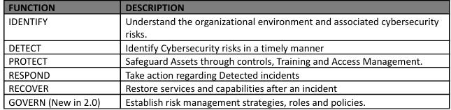 five areas: Identify, Protect, Detect, Respond, and Recover. A 6th function – “Govern” is included as one